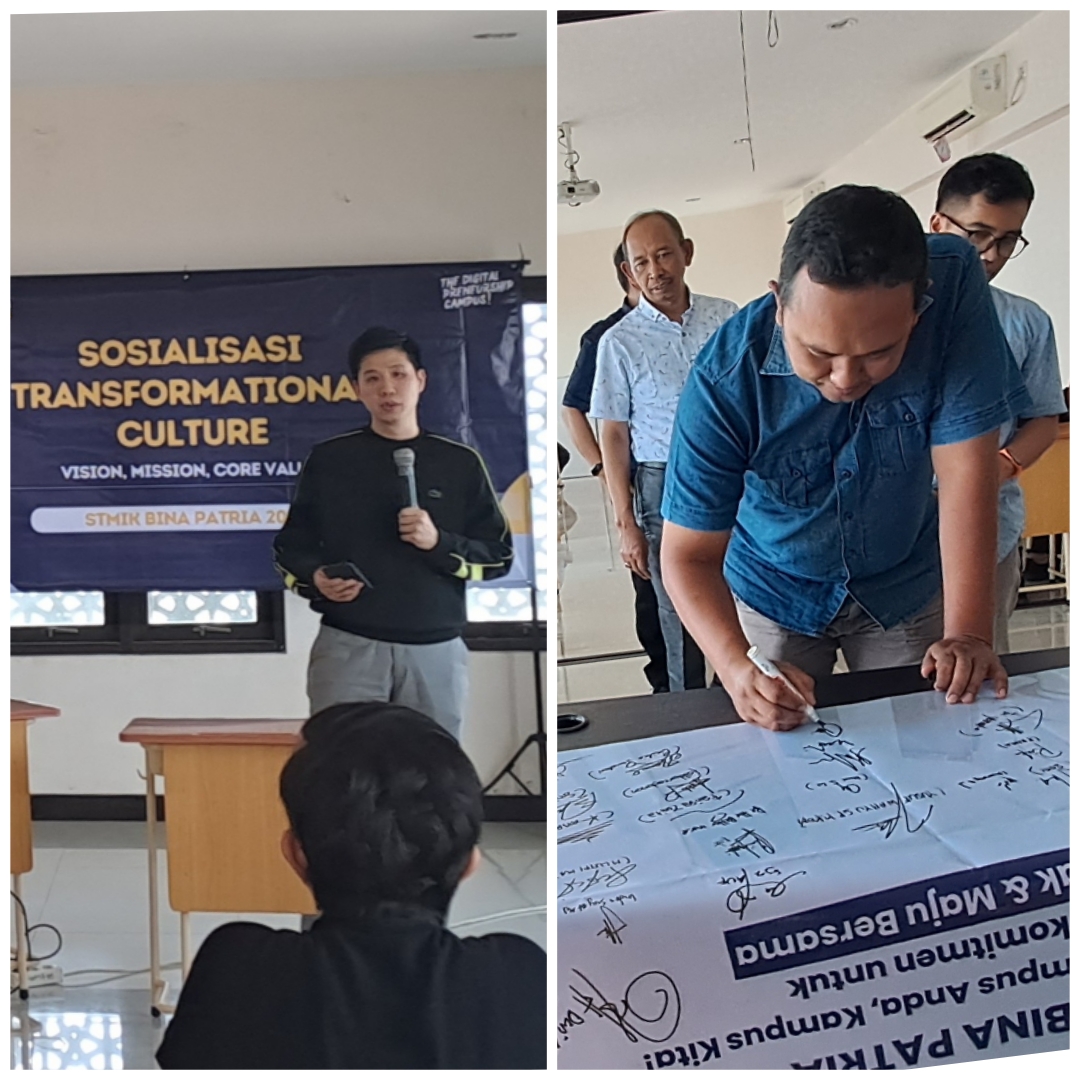 Demikian disampaikan Ketua Pembina Yayasan Bina Patria, Hans Hadi Surya, SE,AK.,CA.,M.Buss dalam acara rapat dan diskusi bersama antara Yayasan dengan Dosen dan Tenaga Kependidikan serta Student Staf STMIK Bina Patria dengan tema “Sosialisasi Transformational Culture” yang menekankan pada visi, misi dan nilai-nilai sikap. Kegiatan ini diselenggarakan di lantai 3 kampus 2 STMIK Bina Patria, Sabtu (08/06/2024). Turut hadir dalam acara ini antara lain Pembina dan Ketua Yayasan, Ketua STMIK BIPA, Pembantu Ketua I,II, dan III, Dosen dan Tendik serta Student Staf.