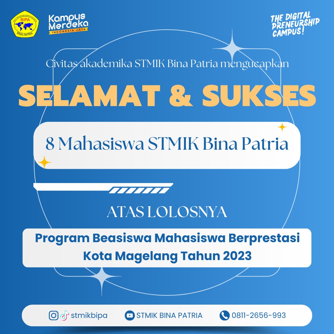 Dalam program penerimaan beasiswa mahasiswa berprestasi tahun 2023 ini, sebanyak delapan mahasiswa STMIK Bina Patria lolos dalam seleksi penerimaan beasiswa berprestasi. Kedelapan mahasiswa tersebut berasal dari berbagai Program Studi yaitu Teknik Informatika, Sistem Informasi dan Manajemen Informatika diantaranya Gabriella Meisye Damay, Windi Rizki Septiana, Arif Bagus Prasetyo, Abdul Raffi Al ‘Mauka Istiadi, Bagus Rahmat Alfian, Anastasia Viona, Rista Kurnia Wandani, dan Muhammad Ridho Agung Wicaksono. Para penerima beasiswa ini akan menerima sebesar Rp. 3.000.000,- untuk masing-masing mahasiswa.