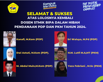 Dosen STMIK Bina Patria Magelang pada (28/06/2024) kembali menunjukkan kualitasnya. Hal ini terlihat dari pengumuman lolosnya beberapa Dosen dalam program Pendanaan hibah PDP (Penelitian Dosen Pemula) yang diadakan oleh Direktorat Jenderal Pendidikan Tinggi, Riset, dan Teknologi (Ditjen Diktiristek) dibawah Kemdikbud Ristek. Mereka adalah Kanafi, S.Kom.,M.Kom, Dwi Astuti S.Kom.,M.Kom., Sri Waluyo, M.Pd. dan Muhammad Abdul Muin, S.Kom.,M.Kom, dan Program Pengabdian Kepada Masyarakat HM. Lutfi MA, MT serta Yeza Febriani, MSc. Mereka lolos dengan program masing-masing yang berbeda.