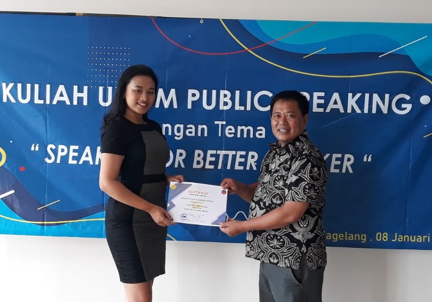 Melalui kegiatan ini, diharapkan para mahasiswa dapat semakin menjadi seorang public speaker yang baik, terutama ketika mahasiswa presentasi di kelas baik sebagai presenter/penyaji, moderator, penanya/peserta. Pelatihan diikuti sekitar 30 peserta terdiri dari mahasiswa setempat dan siswa sekolah menengah se Magelang.