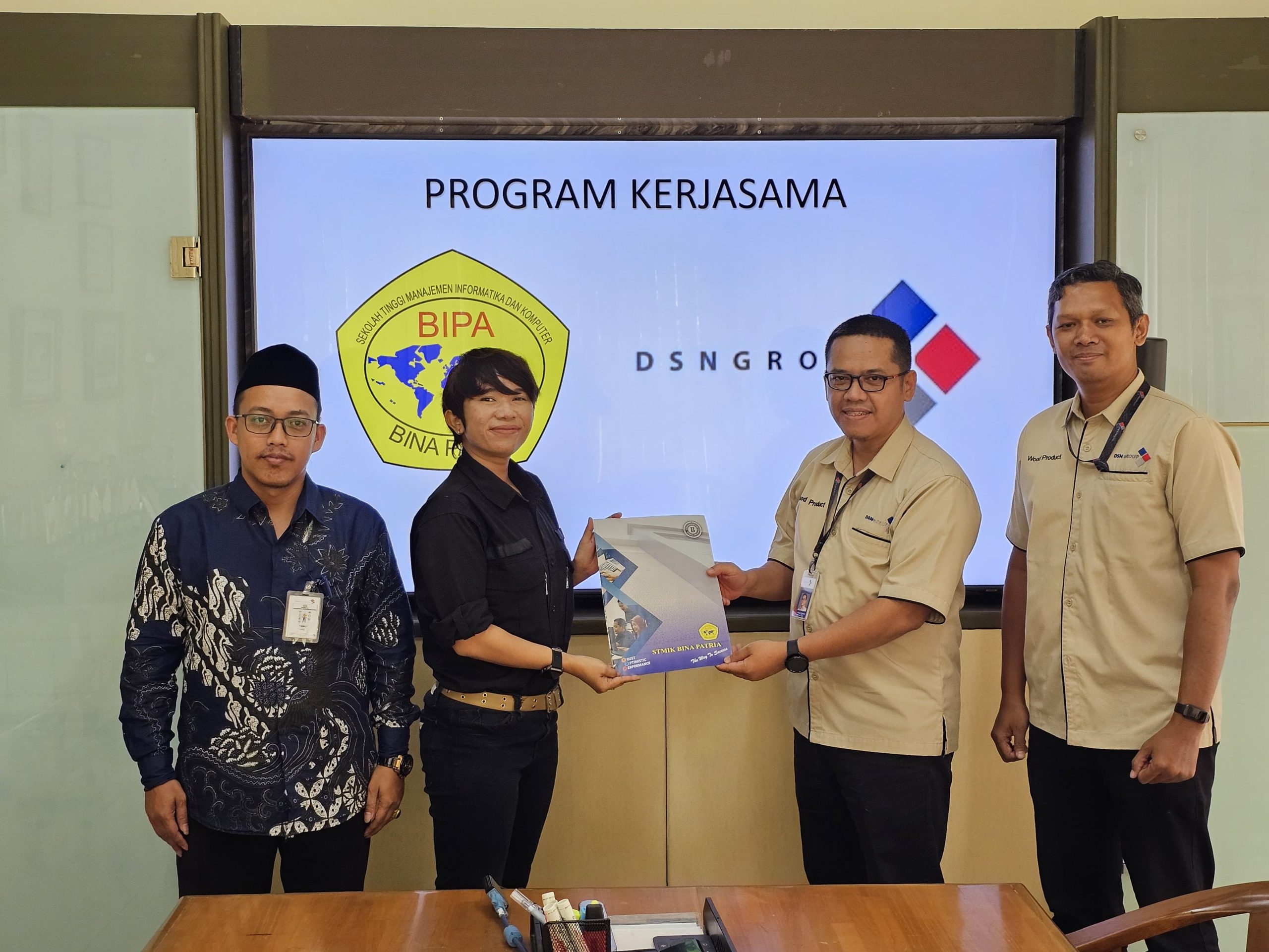Dalam rangka implementasi kegiatan Program Magang dan Pengabdian Masyarakat di Perusahaan industri, STMIK Bina Patria melaksanakan penandatangan perjanjian kerjasama dengan salah satu Perusahaan Industri di Temanggung, yaitu PT. Dharma Satya Nusantara Tbk (DSN Group) , untuk kegiatan magang industri. DSN Group adalah perusahaan agroindustri yang bergerak di bidang kelapa sawit, produk kayu dan energi terbarukan. DSN Group berdiri pada tahun 1980 dengan nama PT. Dharma Satya Nusantara Tbk. Kantor pusatnya berlokasi di Jakarta dan mempunyai beberapa cabang salah satunya berada di Kawasan industri Pringsurat Temanggung.