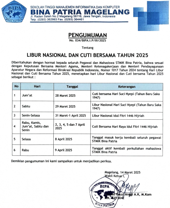 Berkaitan dengan libur lebaran tahun 2025 ini, Ketua STMIK Bina Patria melalui Wakil Ketua 1 Bidang Akademik dan Kemahasiswaan mengeluarkan Surat Edaran bernomor 034/BIPA.I.P/III/2025 tentang Libur Nasional dan Cuti Bersama tahun 2025 termasuk libur idul fitri 1446 Hijriah bagi Mahasiswa dan Pegawai di lingkungan STMIK Bina Patria.