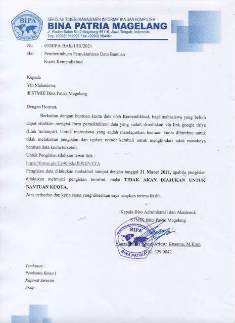 Bagi mahasiswa yang sudah mendapatkan bantuan tersebut dihimbau untuk tidak melakukan pengisian dan update data kembali untuk menghindari tidak masuknya bantuan kuota tersebut.