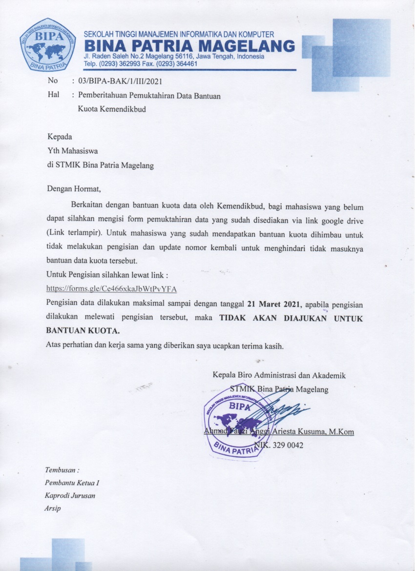 Bagi mahasiswa yang sudah mendapatkan bantuan tersebut dihimbau untuk tidak melakukan pengisian dan update data kembali untuk menghindari tidak masuknya bantuan kuota tersebut.